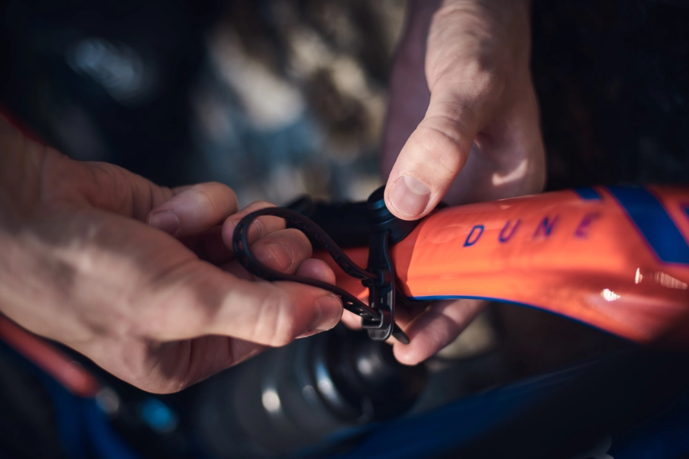 - Le support est fixé au cadre du vélo à l’aide de 2 serre-câbles souples et refermables, qui sont sûrs et antidérapants. Il suffit d’approcher la bouteille du support pour que l’attraction magnétique l’attire. Le mécanisme de fixation sécurise ensuite la bouteille.