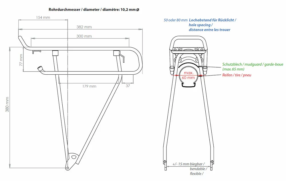 - Espacement des trous pour le feu arrière : 50 et 80 mm