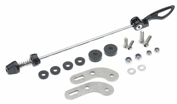 Axe rapide avec un jeu de tôles d’adaptation et matériel de fixation pour le montage du support HR sur des cadres sans œillets filetés.